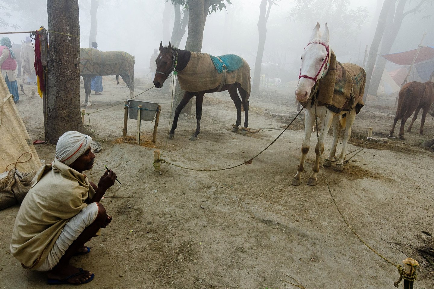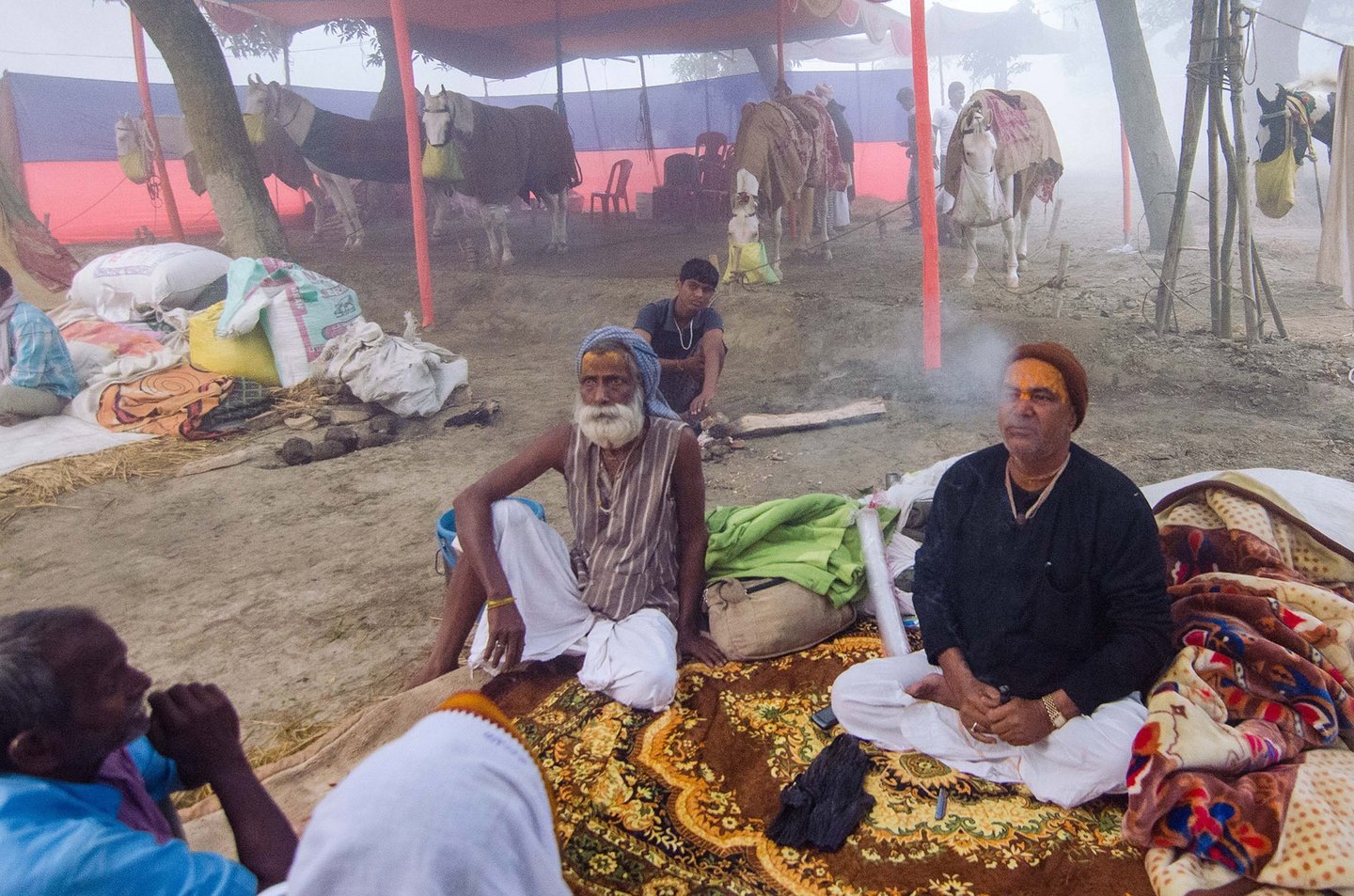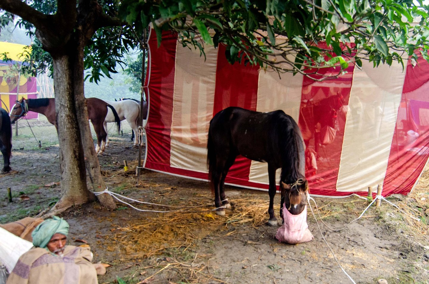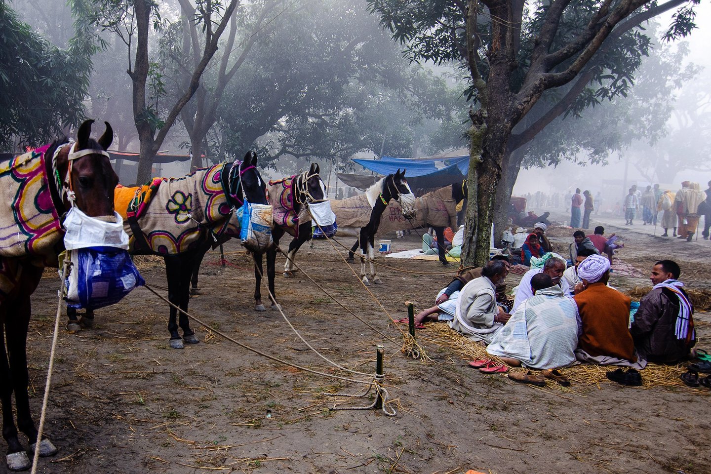The entire fair takes place area covered with dense mango tress. The Winter morning in that area , wrapped in mist feels like stepping into a serene dream. The air is chilly and dense with fog, blurring the edges of the world. Narrow dirt paths are barely visible, covered with a thin layer of dew. Trees stand like silent sentinels, their outlines softened by the white shroud of mist.